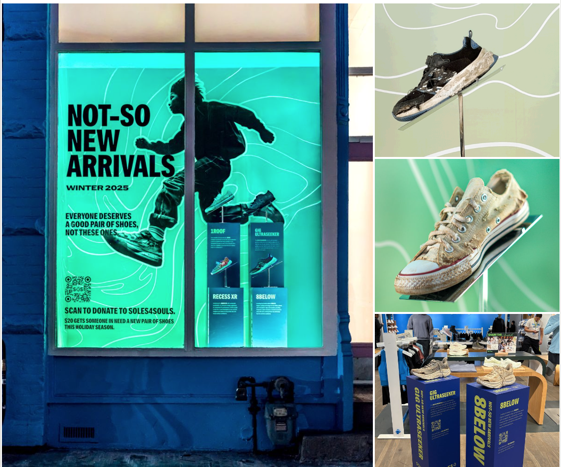 Called “Not So New Arrivals,” the pop-up featured heavily worn shoes to highlight a simple truth: something many of us take for granted can be life-changing for someone in need. A proper pair of shoes. A QR code in the window allowed passersbys to donate instantly.